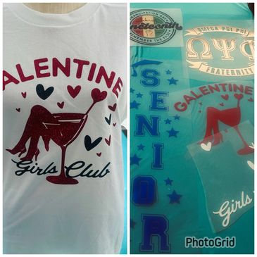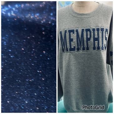 Your design will be embroidered on your item. This only works with the glitter vinyl. You will tear the extra vinyl that is not included in the design. Then you can add names on the front, back or sleeves in the same or a different color. Get creative and add a design or a patch. Then seal it with a press and shine like a DIAMOND.